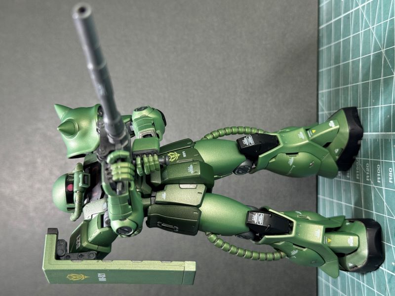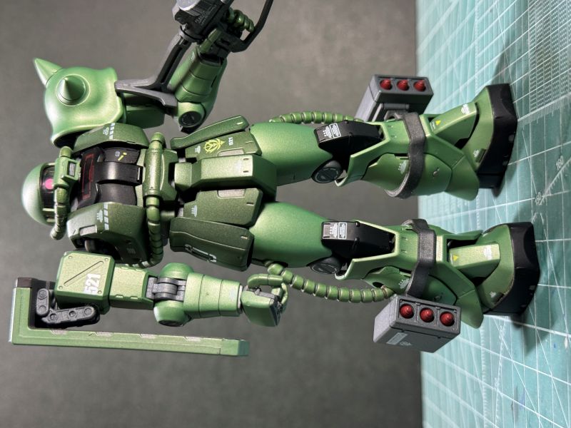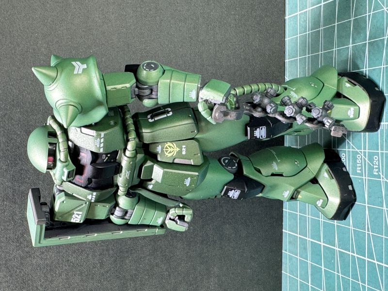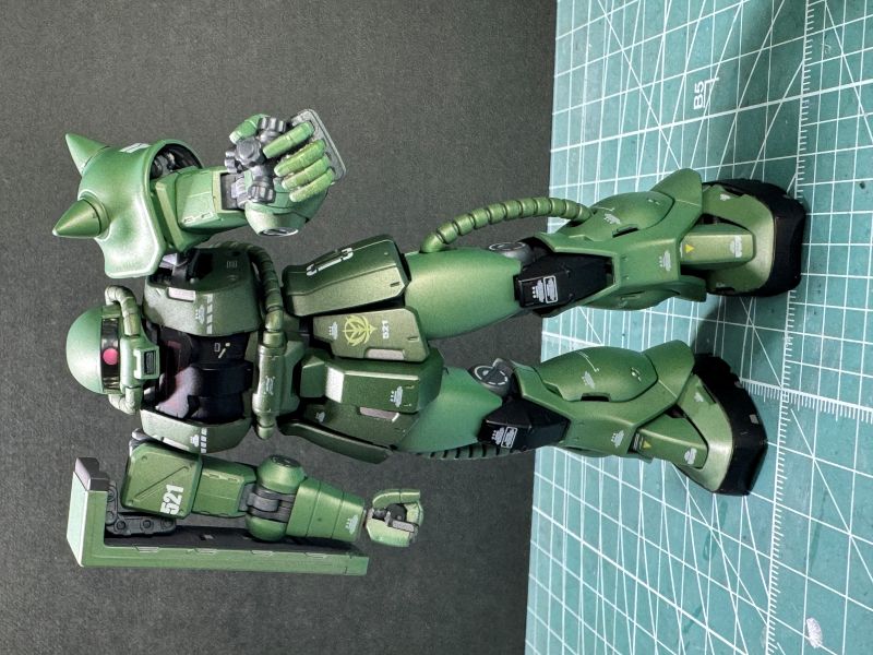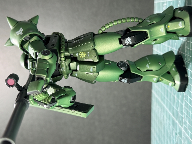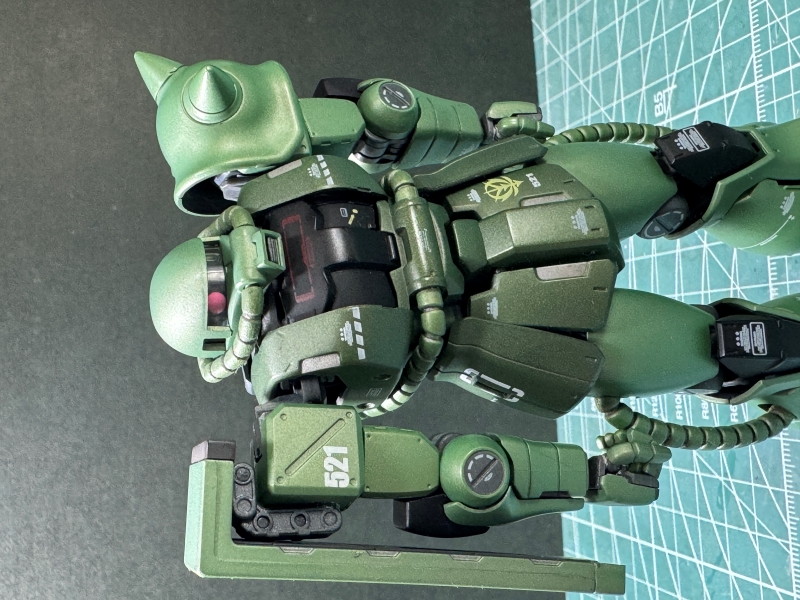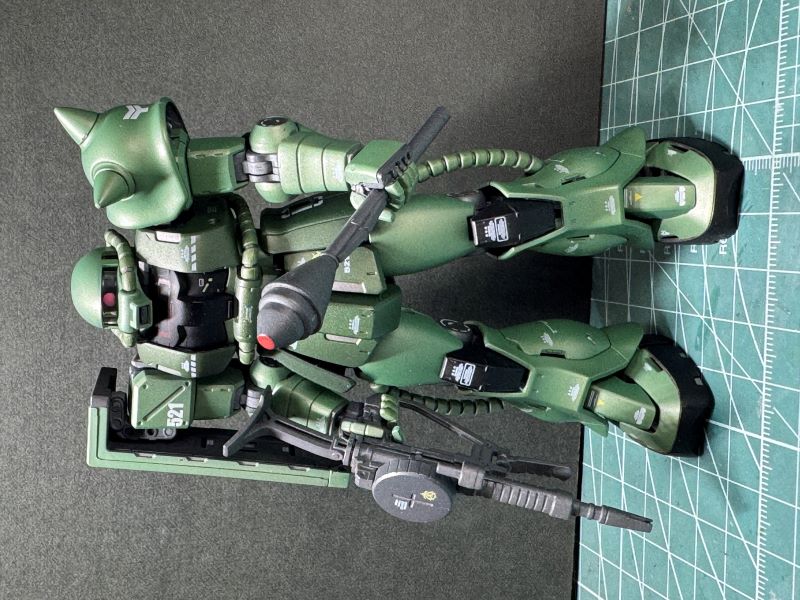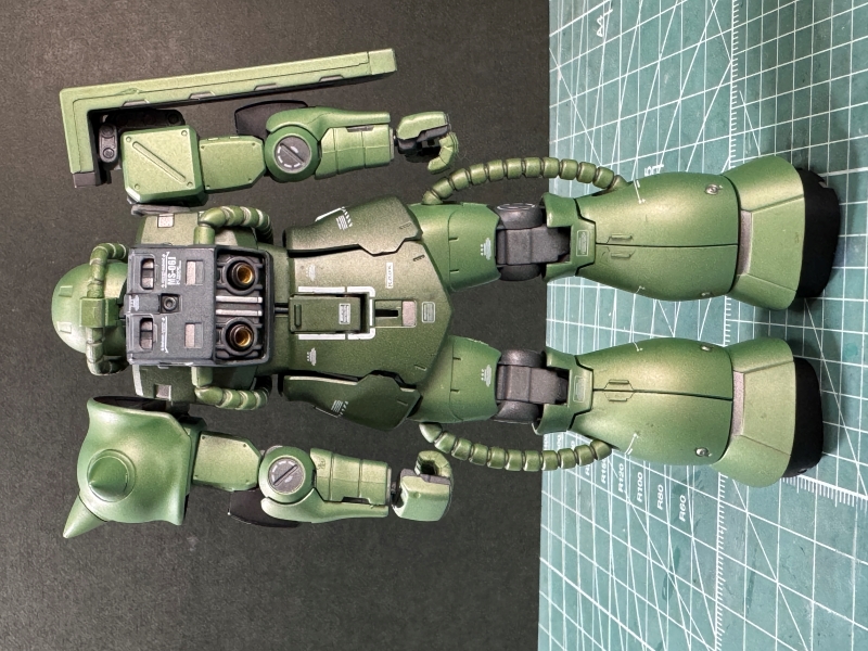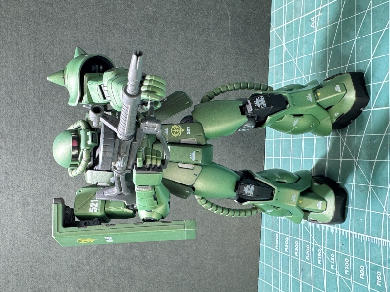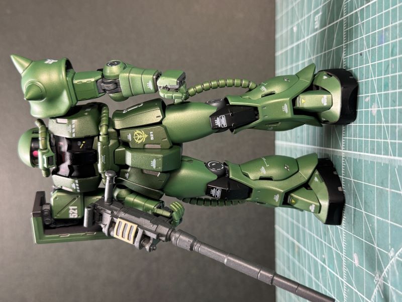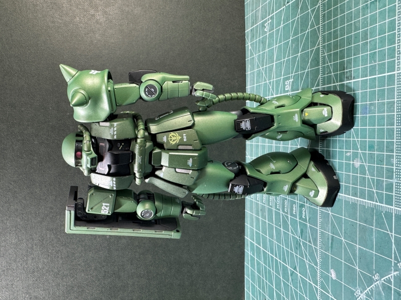 全身を前と後ろから。かなり精巧に造られているのがわかるでしょう。塗装はメタリック調で光沢があります。スタイルは今風のスマートな感じにしつつもザク本来の武骨さもしっかり出てます。