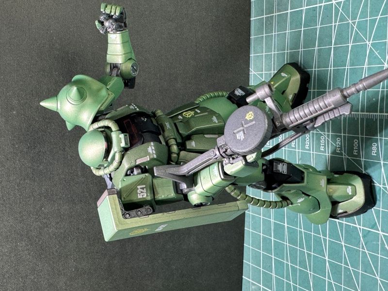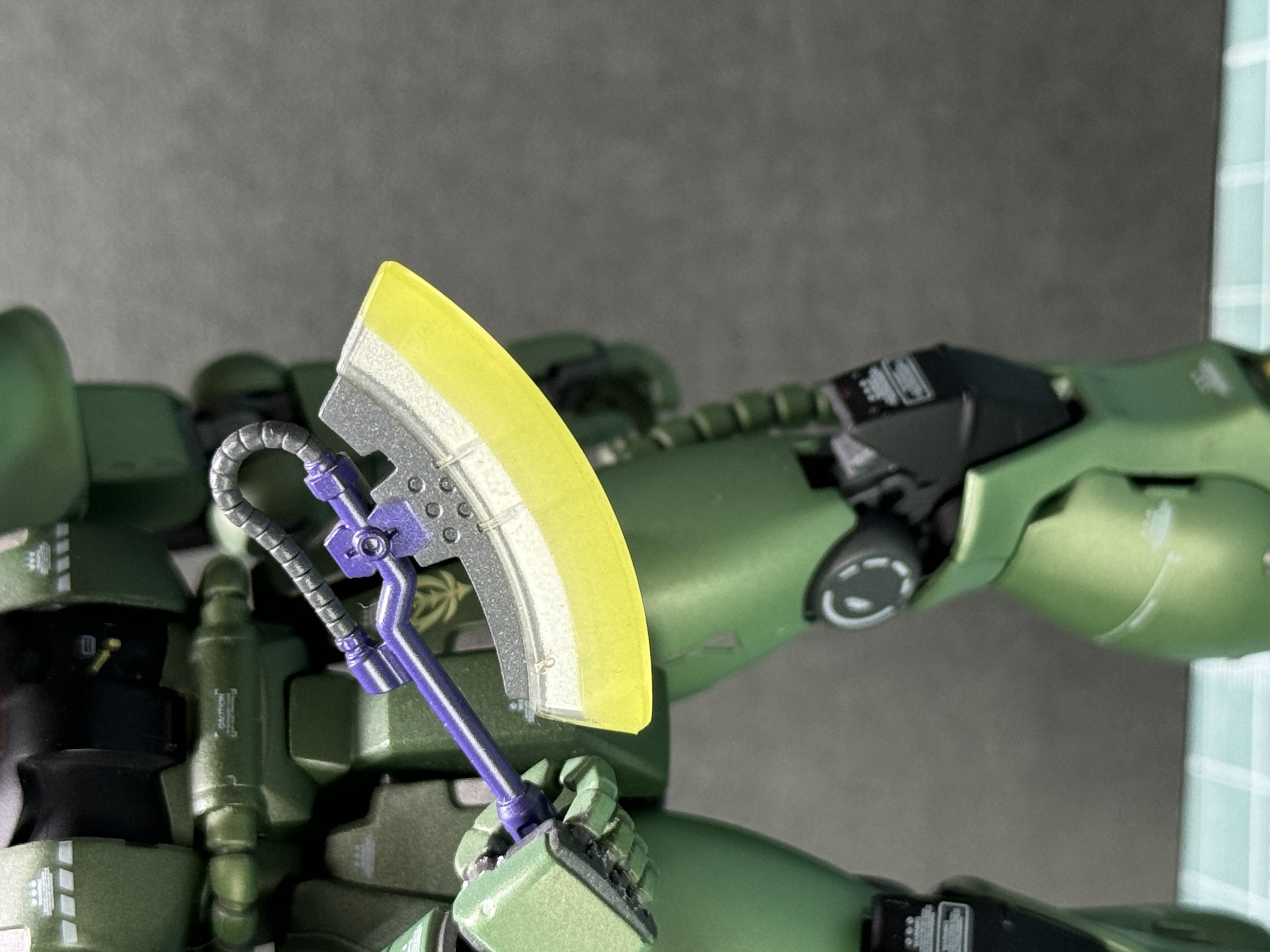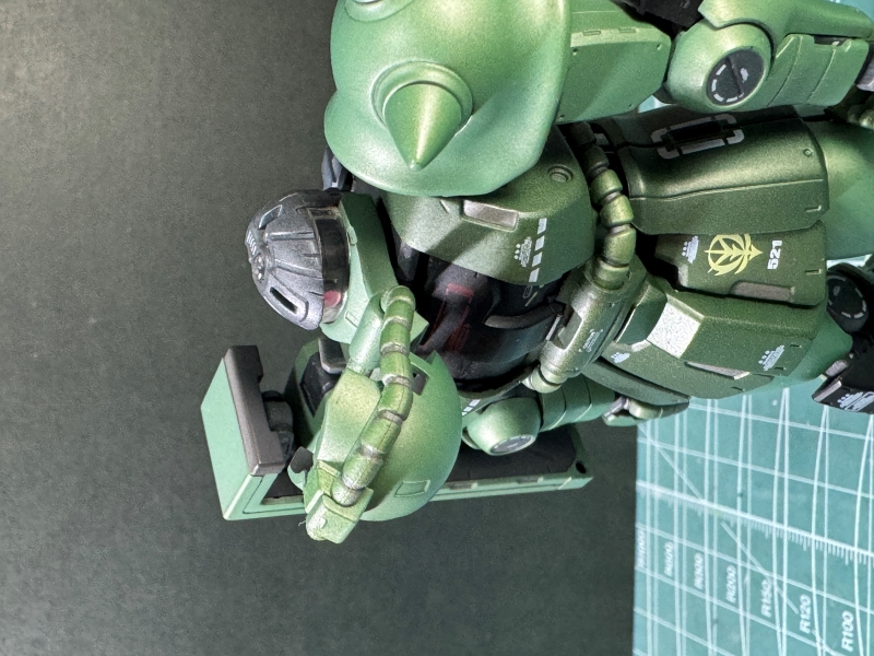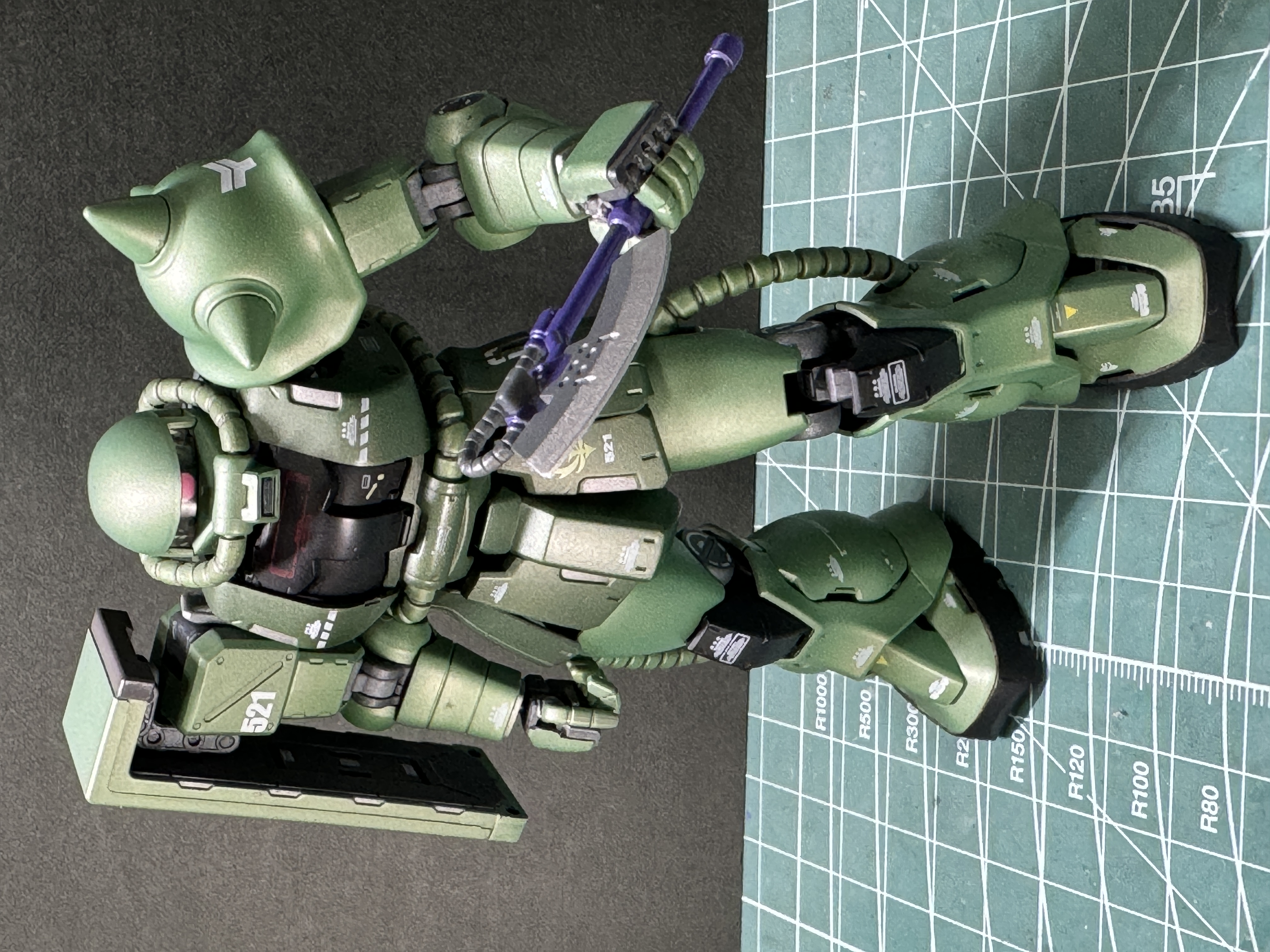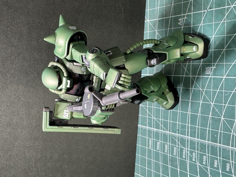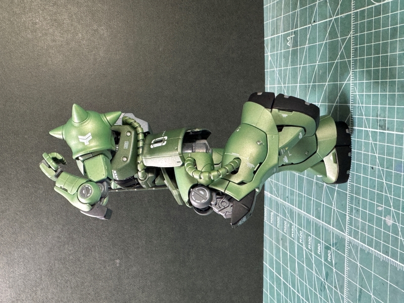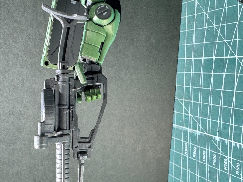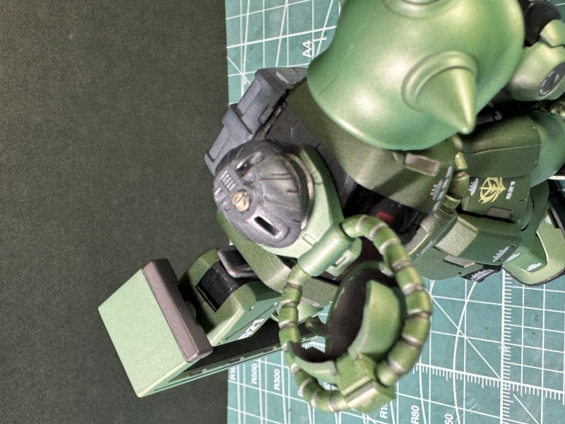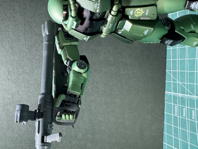 ザク・マシンガンは最も標準的な装備ということもあって、飾ったりポージングさせて遊ぶときにはいつも装備させていました。手のひらの突起とそれがはまるザク・マシンガンのグリップの穴が摩耗・変形してはめてもゆるゆるの状態です。特にグリップの穴のゆがみが進行してます。そのこともあって、さすがにゆるゆるで手に保持することが難しくなってきました。16年も経っているから仕方ないのかもしれません。例によってパーマネントマットバーニッシュを少量塗布することで保持力が戻ります。ただし、白いカスが手のひらに残るので若干見た目が汚くなります。とはいえプラモデル用接着剤で穴を狭めたり、突起を膨らませたりというのはかなり繊細な部分だけに調整に技術力が必要かと思います。