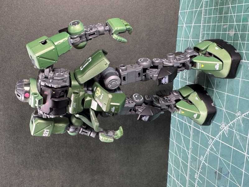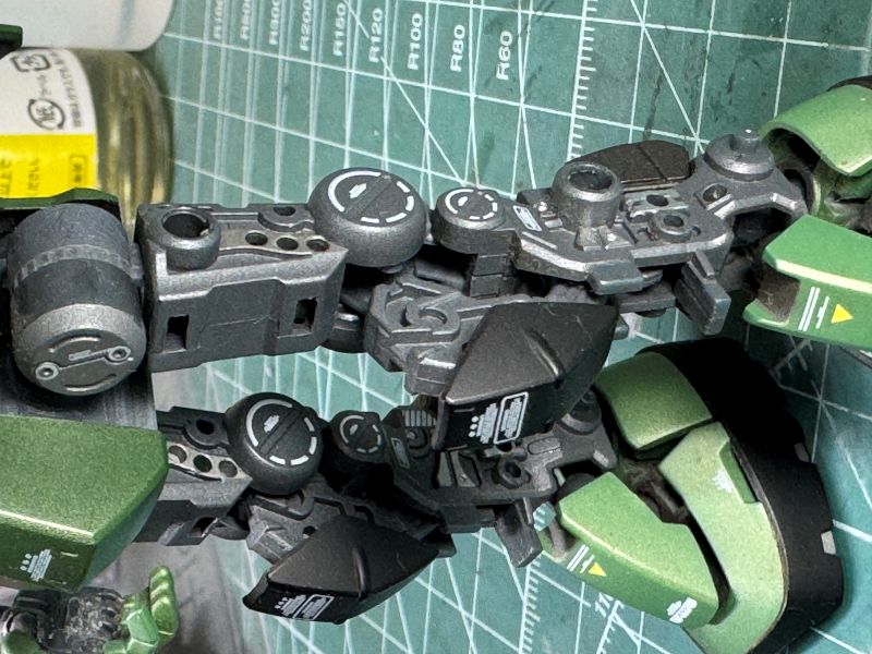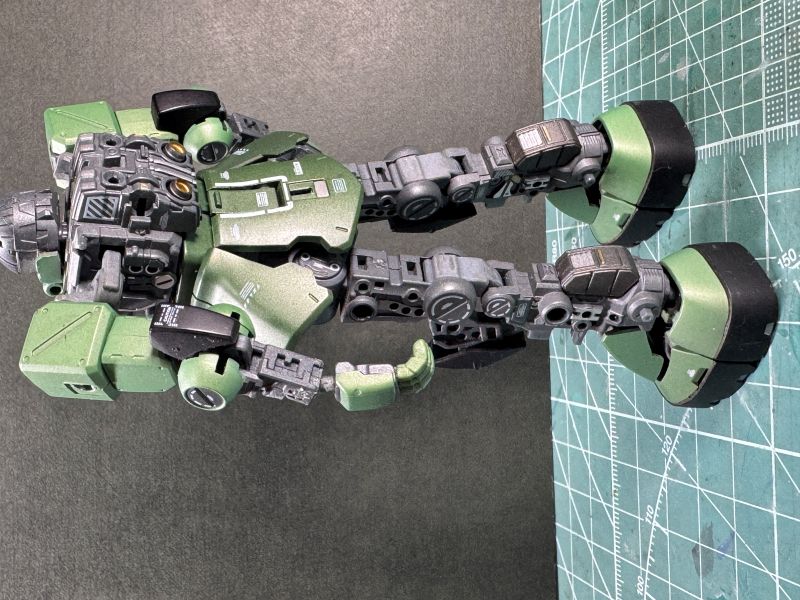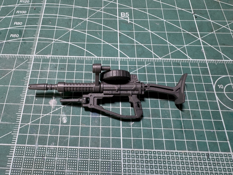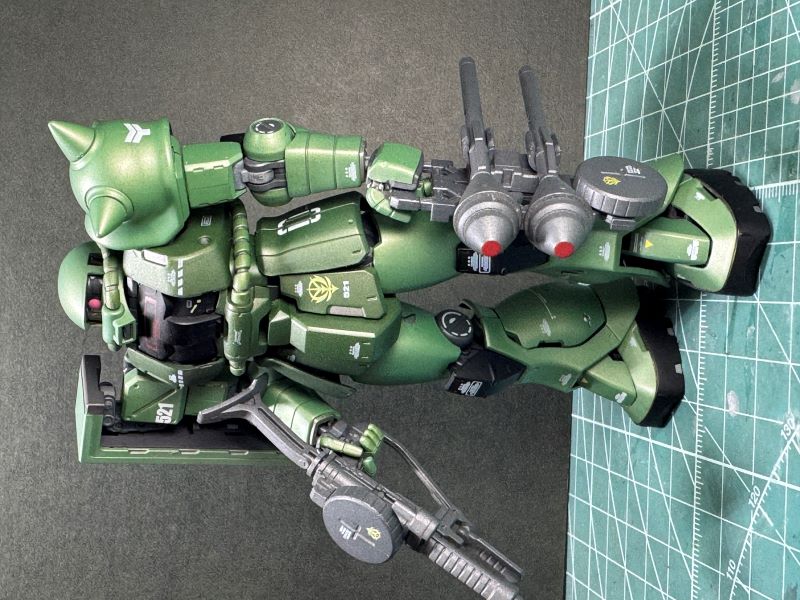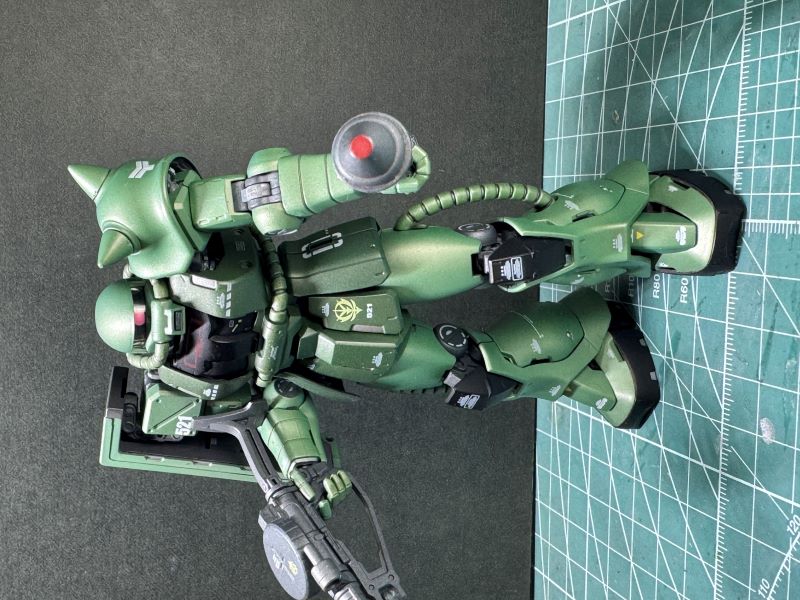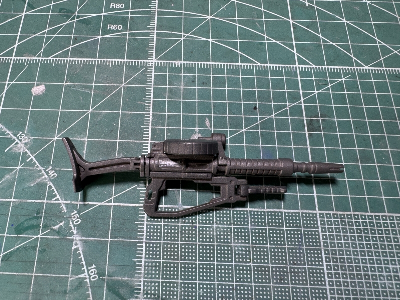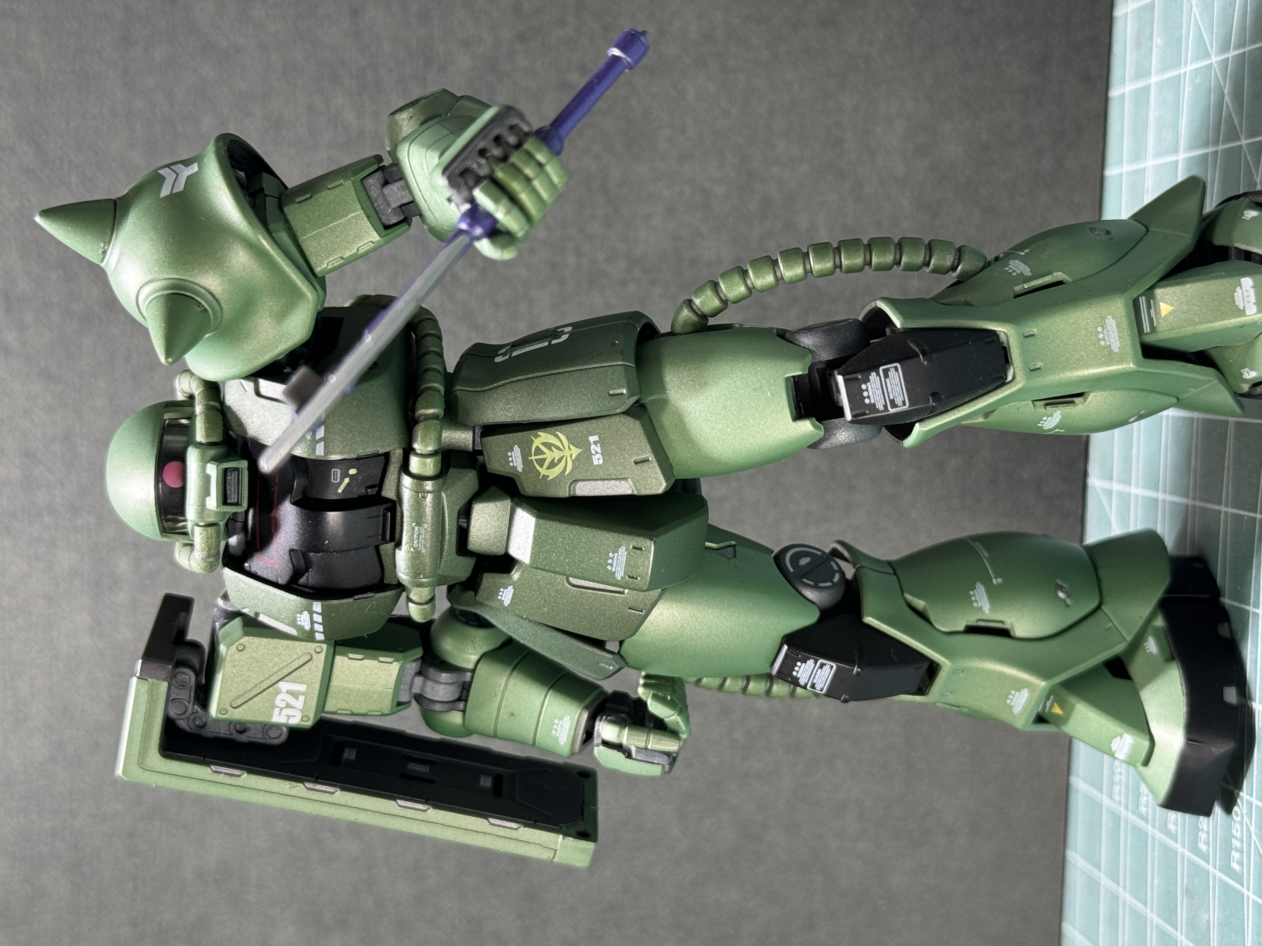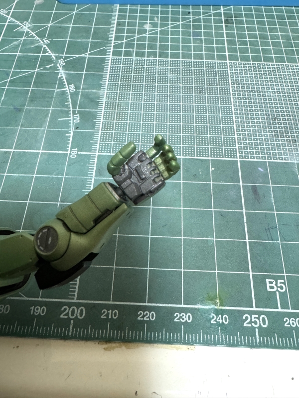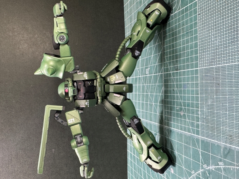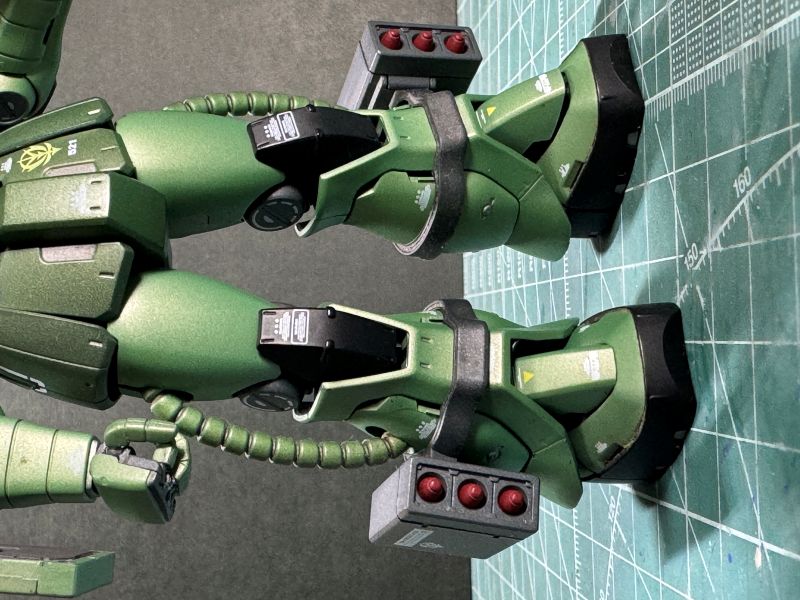 ザク・マシンガンは最も標準的な装備ということもあって、飾ったりポージングさせて遊ぶときにはいつも装備させていました。手のひらの突起とそれがはまるザク・マシンガンのグリップの穴が摩耗・変形してはめてもゆるゆるの状態です。特にグリップの穴のゆがみが進行してます。そのこともあって、さすがにゆるゆるで手に保持することが難しくなってきました。16年も経っているから仕方ないのかもしれません。例によってパーマネントマットバーニッシュを少量塗布することで保持力が戻ります。ただし、白いカスが手のひらに残るので若干見た目が汚くなります。とはいえプラモデル用接着剤で穴を狭めたり、突起を膨らませたりというのはかなり繊細な部分だけに調整に技術力が必要かと思います。