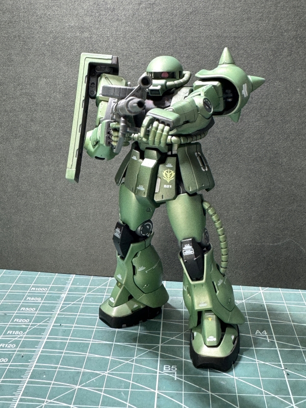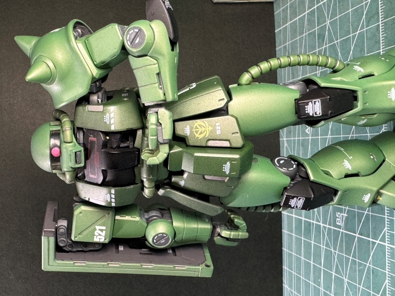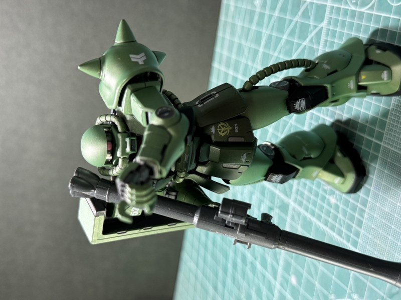 塗装について。落ち着きのあるマットパール塗装が施されています。SHCM-Proの塗装は同時期に発売されたガンダム系アクションフィギュアの中でも飛び抜けて美麗でした。うちにあるこのザクⅡは購入した2008年7月から、実に16年間ディスプレイケースに入れられることもなく飾られてますが、綺麗な状態のままです。色褪せも剥げもありません。しっかりした美しい塗膜となっています。
