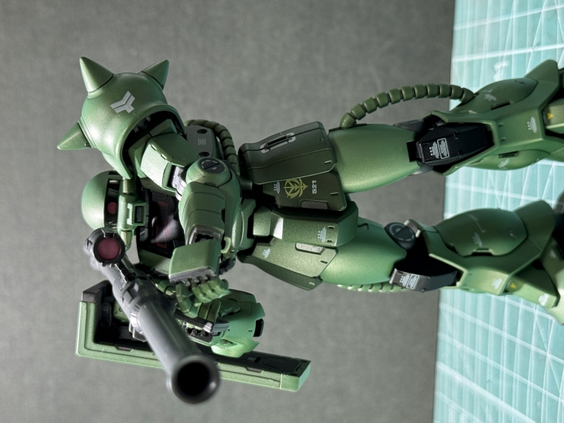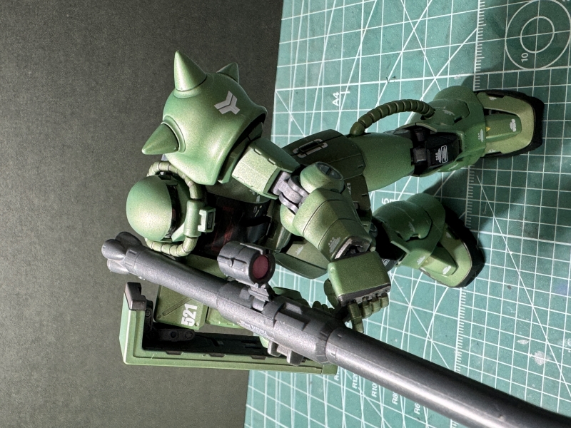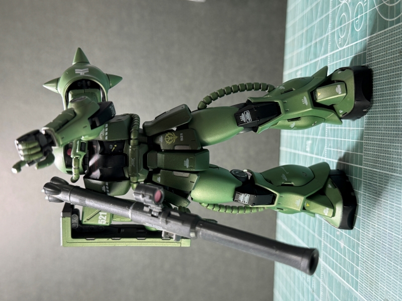 バズーカを構えた図。両手保持で構えさせることができます。肩に乗せて構える方式なのでショルダーストックの干渉に苦心するザク・マシンガンより簡単にポージングできます。スコープもしっかりモノアイの前に持ってこれるし、きちんと構えることができます。