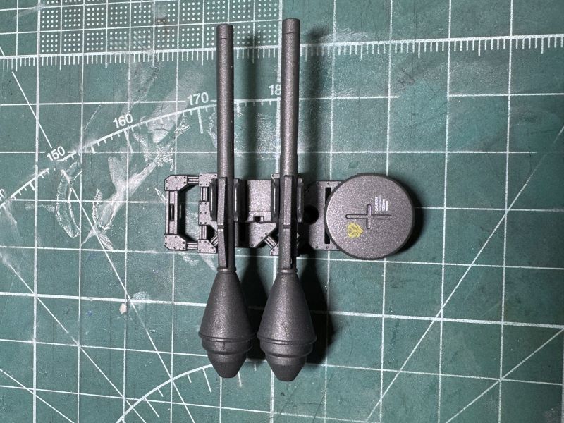 ホルダーを90度回転させてシュツルムファウストを横向きにマウントすることもできます。そうすると、下の空いてるスペースに予備のマガジンも付けられます。このマルチラックを手に持って前線に向かっている感じがこの陸戦型ザクの一番おいしいシーンだと思ってます。