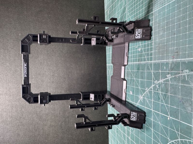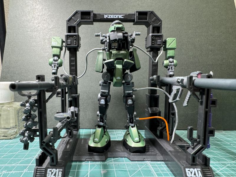 機体の各所に空いている穴にコードを接続し、ベースと連結することでメンテナンス中の機体をイメージできます。腕は取り外してベースに接続できます。いい雰囲気を演出できます。