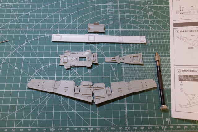 いよいよ製作に取りかかる。まず、こういった複数パッケージの製品を組み合わせる場合、それぞれのマニュアルを一度通して読んで確認をしたほうがいいだろう。というのも、どのタイミングで本体のインスト(説明書)からオプションパーツのインストにシフトするかをチェックしておく必要があるからだ。さもないと勢いで本体側の製作を進めてしまい、オプションパーツの組み込みにはすでに手遅れなんてことにもなりかねない。本体とオプションパーツのインストを切り替える箇所をチェックしておく。この技MIX P-3Cでは電装部品を胴体に収納するため、かなり初期の段階でオプションパーツのインストを参照する必要があるようだ。