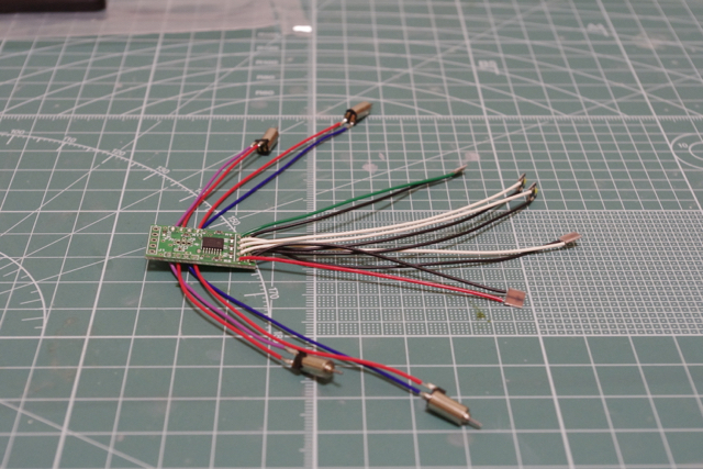 組み込むユニット。IC基盤からエンジンの個数と同じ4つの小型モーターと点滅する航空灯用LEDが3つ、さらに翼の両端で航空機の進行方向を知らせるための翼端灯用LED2つがコードで接続されている。基盤とコードはごく簡単なハンダ付けのみでつながっており、少しでも力加減を間違えたら引きちぎれてしまいそうな印象だ。細心の注意を払って取り扱う必要がある。
