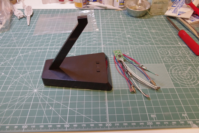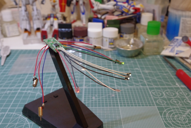 ユニットと台座を接続し、作動チェック。台座にあるスイッチで作動モードを切り替えられるのでここでは一斉動作を行うテストモードでスイッチオン。モーター、LED全てが作動していることを確認した。まだ、組み込まれていないにも関わらず点滅する白色LEDを見るだけでも心が躍る。