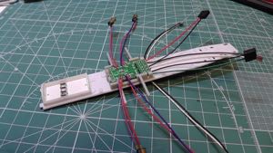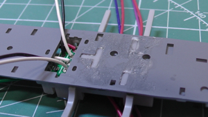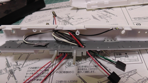 こういう凡ミスはあまりしないのだが。コードや基盤に気を取られてしまって確認を怠ったのが原因か。しばらく落ち込んだ後、このまま進めるわけにもいかないので、慎重に接着した台座を仕切板から剥がして正しい側に接着し直した。剥がした側の面は当然ながら写真のように思いっきり荒れてしまった。塗装済みキットでこんなの修正きくのか?キット買い直しまで検討したが、よくよく図面で確認すると仕切板は外からはよく見えないようだ。透明のウィンドウから覗き込めば多少は見えるかもしれないが、そもそも中はそれほど作り込まれていないし、発光モジュールの配線もゴチャゴチャ走っていてそれほど内部を覗くこともないだろうと判断し、このまま続行することにする。仕切板の荒れた面の修正も行わない。っていうかできません。