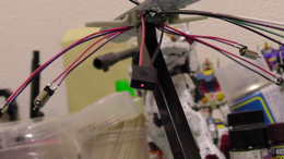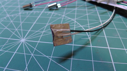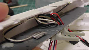 航空灯として機能する白色LEDの設置。小指の爪よりも小さいLEDを定位置に持って行き、なおかつ瞬着で固定するのはなかなか苦労した。コードの戻る力で位置がずれていってしまうので固着するまではピンセットで保持しておく必要があった。