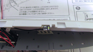 胴体内に仕切板とユニットを格納する作業。コードに必要以上の余裕があるので慎重に仕切板の上に余剰分を逃がし、航空灯LEDを機体上部と下部の所定の位置に接着する。ここではゼリー状瞬着を使用した。なお、使用しない遮光シールで覆ったLEDについては仕切板の邪魔にならない位置にセロテープで固定した。
