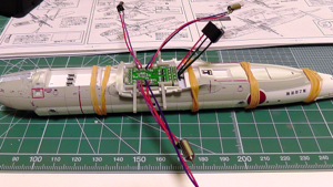 航空灯用LEDを固定した後に、ユニットと仕切板を胴体内に格納、もう一方の胴体パーツと張り合わせる。こういった内臓ギミックの有無に関わらず、エアモデルの胴体を組むときにはしっかりと接着するために輪ゴムを使って圧着させるのがセオリー。この状態で約1週間ほど放置した。