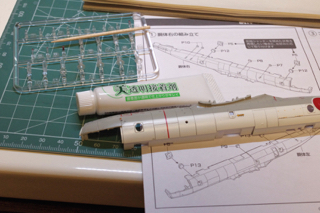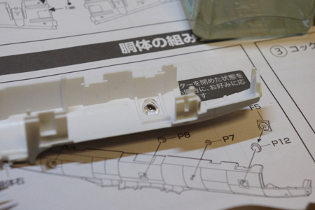 胴体の組み立てはウィンドウの取り付けから始まる。せっかく高いプラモを作るのだから、なるべく綺麗に作りたい。そこでクリアパーツの専用接着剤を用意した。が、これは今回は使えないっぽい。試しに慎重にウィンドウのクリアパーツにヤスリがけを行った後、クリアパーツ用接着剤を用いて胴体にはめてみようとしたが、なかなかうまくいかなかった。技MIXは塗装済みキットなので塗膜の厚さ分、クリアランスに余裕がないのでパーツがはまりにくい。インストによると流し込みプラ用接着剤を使用して、塗膜とプラを若干溶かしながら接着するのが綺麗に組むコツと書いてあった。クリアパーツに関してもどうやら同様の手順を踏む必要がありそうだ。