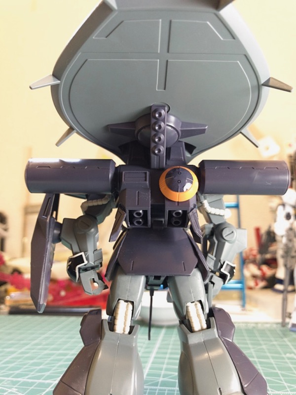 頭部と一体化された巨大なレドームが最大の特徴である本機だが、やはりバランスが悪く自立をするにもかなりギリギリだ。そして、ボディはほぼHGUCハイザックから流用さ