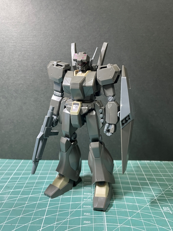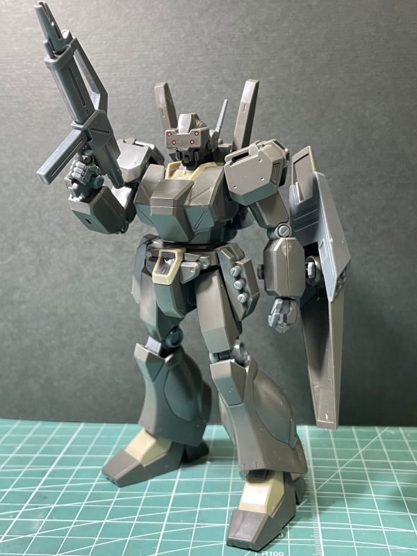 ジェガンの特殊部隊仕様。ダークグリーンのカラーリングと、最大の特徴であるバイザーというセンサーユニット。これだけで十分特殊部隊ですという雰囲気を醸し出している。このジェガンはザクと並ぶ実に息の長い機体という認識がある。初出が「逆襲のシャア」でしょ。「F91」でも時代遅れの機体等位置づけながら出てきているのでU.C.0093からU.C.0123までの30年間現役であり続けたわけだ。現代の戦闘兵器アップデートしつつも40年、50年という長い期間現役であることを考えればリアルな登場期間だといえる。逆にほかのMSが現役期間と開発期間が短すぎるんだね。シリーズごとに登場MSを一新してプラモデル販売につなげるという事情があるにせよ。その中でも複数作品に登場したこのジェガンは、かなりの人気機体であることは間違いない。その特殊部隊仕様が本機だ。