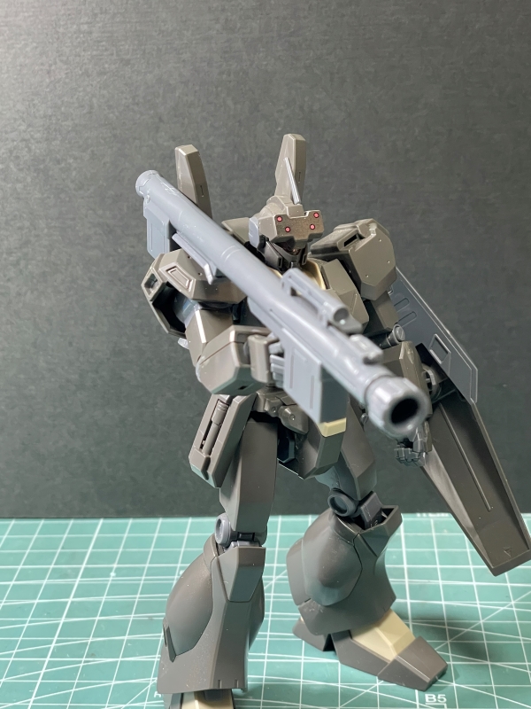 ビーム・ライフル:連邦MSの代表的武装とも言える、速射性に優れた専用のビーム携行火器。初期型の《ジェガン》のものをそのまま流用しているが、射撃時はバイザー・ユニットとの連動によって、広範囲射程距離を獲得している。