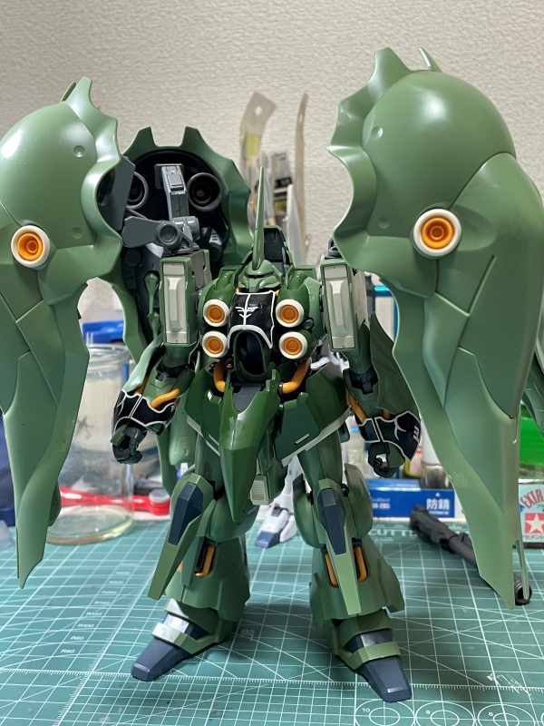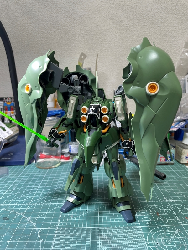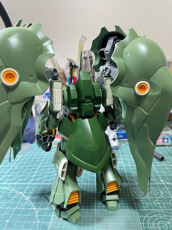 クシャトリヤのキットでもこの4基のバインダーがものすごく表情を与えてくれる。がっちり閉じたり大きく開くとまるで花のように見える。F91に出 てきたMA「ラフレシア」を彷彿とさせる。時代設定的にはF91の方が後になるが。
