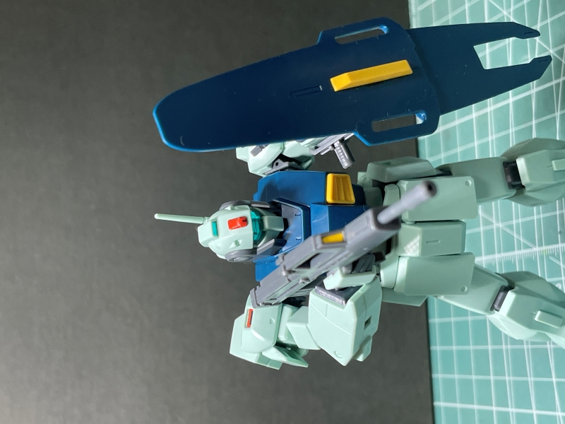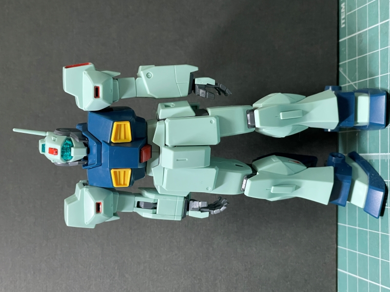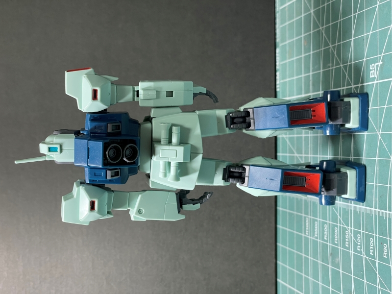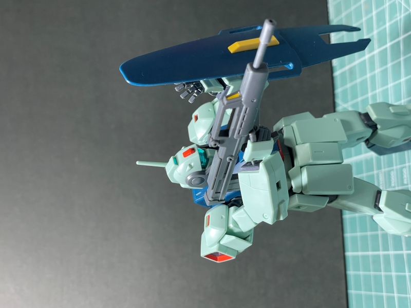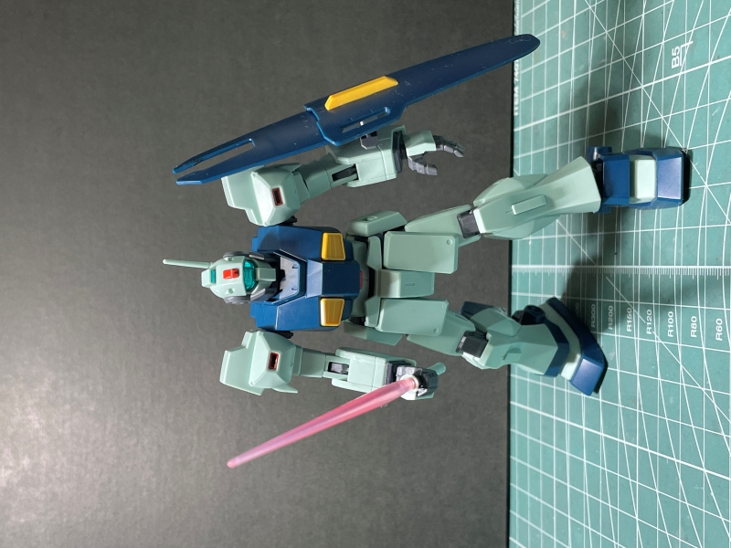 写真を撮るためにいじっていたら気が付いたのだが、HGUCのガンプラで腰だめとはいえライフルを両手で構えることができるというのはなかなか珍しいのでは?角張ってあちこち張り出してるデザインの割に可動領域はなかなか広くポージングに優れている。