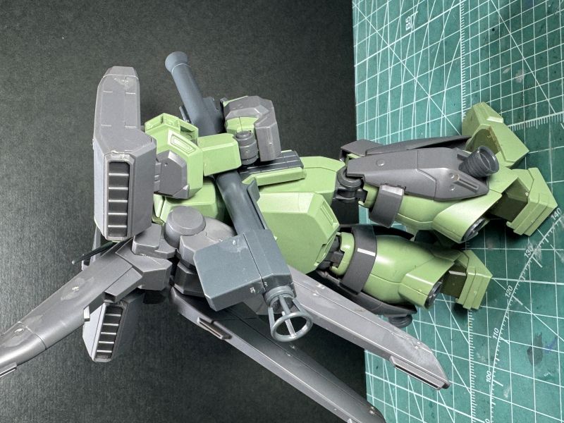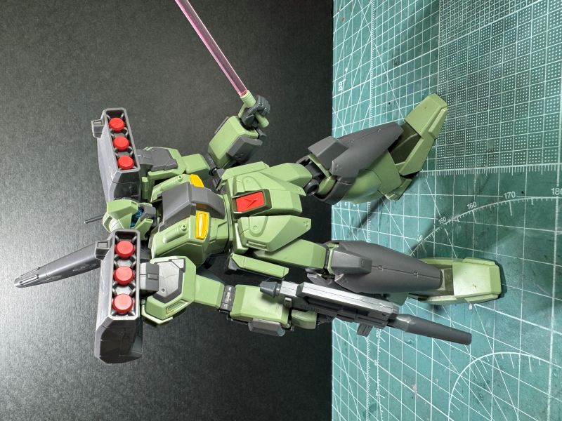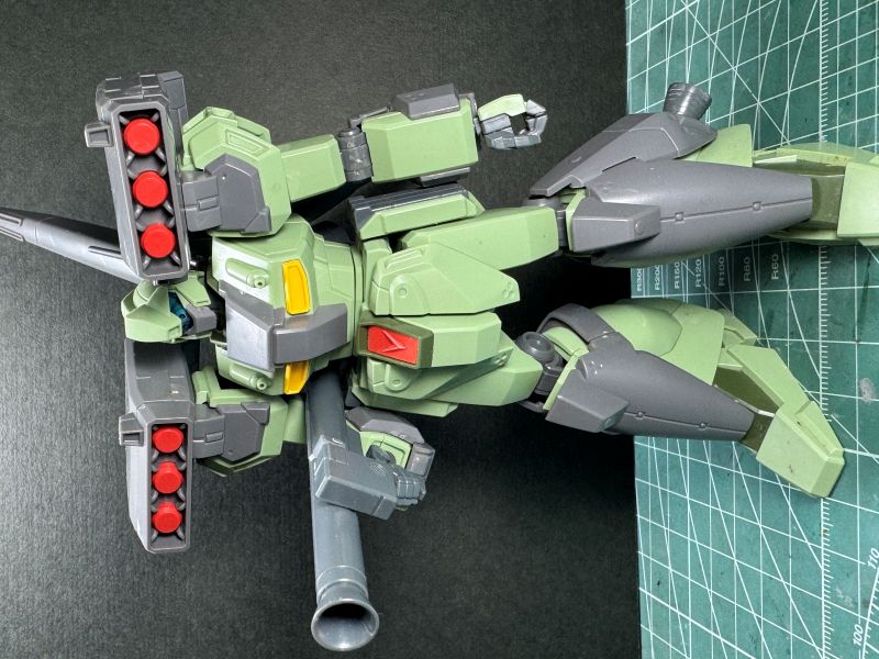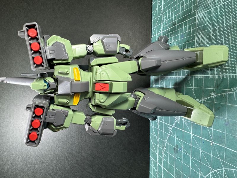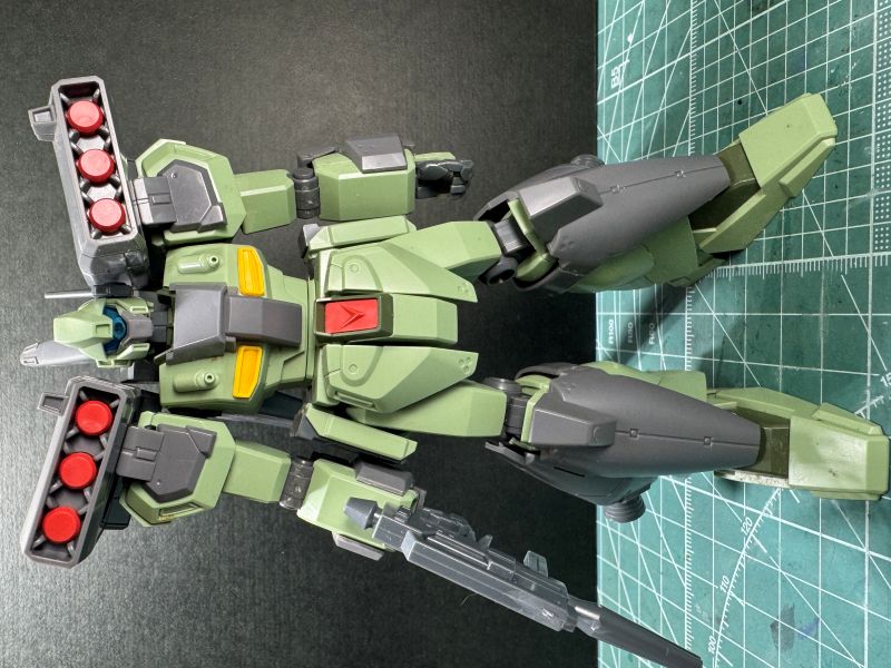 正面。ひと際目立つのは両肩に乗っている3連装ミサイル・ポッドです。機体の各所に装着された増加装甲によって元々はスマートな印象のジェガンが一回り逞しく見えます。